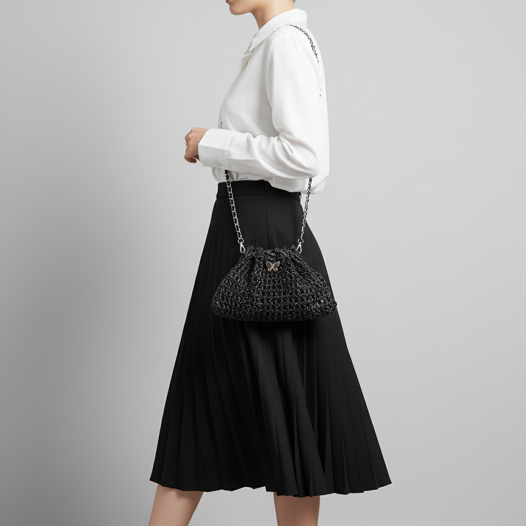 Our signature crocheted butterfly bag isn't factory-made; it stems from our desire to capture the magic of the night sky. We wanted to create a piece that is both nostalgic and timelessly elegant. The silver butterfly is more than just a clasp; it's a symbol of transformation. Just as a single thread eventually becomes a bag, the process transforms a quiet afternoon into a moment of pure creativity.